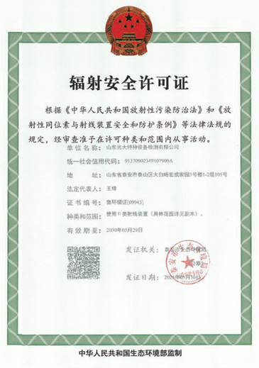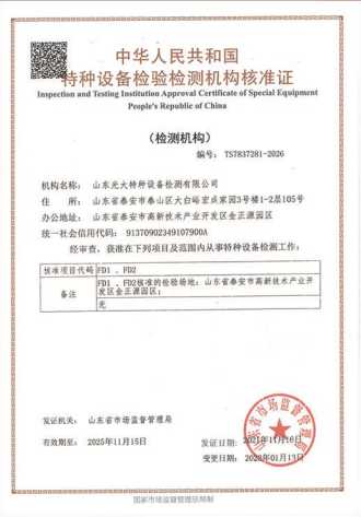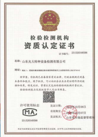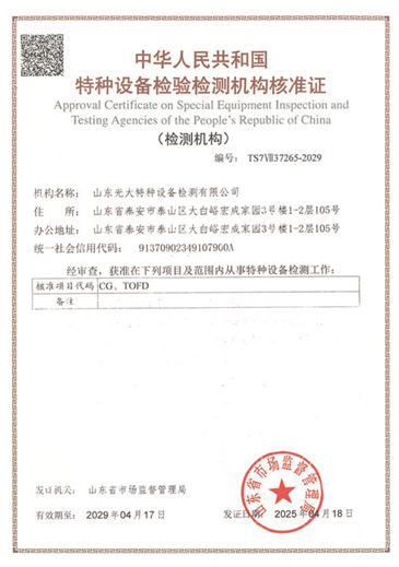 山東光大特種設(shè)備檢測有限公司是經(jīng)山東省市場監(jiān)督管理局核準(zhǔn)的甲類B1特種設(shè)備綜合檢驗機(jī)構(gòu)。2017年9月30日取得了山東省市場監(jiān)督管理局頒發(fā)的《檢驗檢測機(jī)構(gòu)資質(zhì)認(rèn)定證書》。2018年2月22日取得了山東省市場監(jiān)督管理局頒發(fā)的《特種設(shè)備檢驗檢測機(jī)構(gòu)核準(zhǔn)證》(起重機(jī)械)檢驗檢測資質(zhì)。2021年11月取得山東省市場監(jiān)督管理局版發(fā)的《特種設(shè)備檢驗檢測機(jī)構(gòu)核準(zhǔn)證》(安全閥在線、離線)校驗資質(zhì)。2023年11月取得山東省市場監(jiān)督管理局頒發(fā)的甲類檢驗機(jī)構(gòu)B1《特種設(shè)備檢驗檢測機(jī)構(gòu)核準(zhǔn)證》,具有壓力容器(RD2...
